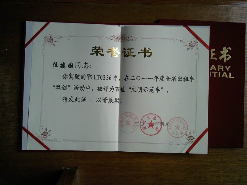 在創(chuàng)建和諧勞動(dòng)關(guān)系活動(dòng)中,荊門(mén)市公交出租汽車有限公司充分發(fā)揮和調(diào)動(dòng)廣大駕駛員的勞動(dòng)熱情和創(chuàng)造活力,獲得了一系列可喜成績(jī)。雷鋒車隊(duì)隊(duì)長(zhǎng)曾凡華,2011年獲得省雙創(chuàng)“文明示范車”、荊門(mén)市出租行業(yè)“服務(wù)先鋒號(hào)”;2012年獲得荊門(mén)市“十佳的哥”榮譽(yù)稱號(hào);前任隊(duì)長(zhǎng)王建春獲得省交通廳“優(yōu)秀班組長(zhǎng)”榮譽(yù)稱號(hào);隊(duì)員任建國(guó)獲省交通廳“文明示范車”先進(jìn)個(gè)人稱號(hào)。2013年6月,公司雷鋒車隊(duì)獲“全國(guó)工人先鋒號(hào)”榮譽(yù)。2014年2月28日,公司鄂HT1223雷鋒車駕駛員張華維獲省精神文明建設(shè)委員會(huì)辦公室、省交通運(yùn)輸廳“雷鋒號(hào)”榮譽(yù)標(biāo)牌。雷鋒車隊(duì)先后涌現(xiàn)出一批優(yōu)秀駕駛員,分別獲得了荊門(mén)出租汽車行業(yè)“服務(wù)先鋒號(hào)”、“十佳的哥的姐”等稱號(hào)及“荊門(mén)市道德模范提名獎(jiǎng)”、“荊門(mén)市見(jiàn)義勇為先進(jìn)集體”。