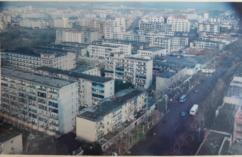 ▲80年代末,荊門市長寧大道街景圖。荊門公交集團(tuán)總公司(舊址)位于長寧大道西側(cè)。當(dāng)年總公司院內(nèi)建有辦公樓、停車場、機(jī)修車間、機(jī)加車間、油庫、倉庫。