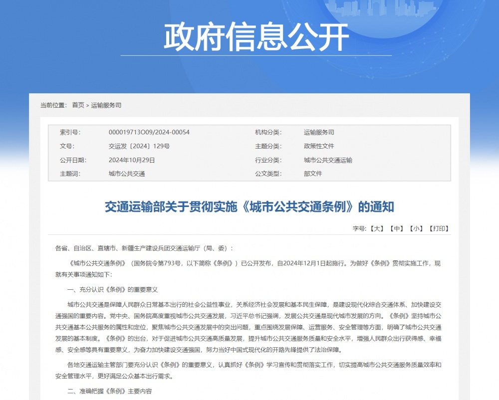 10月29日,交通運輸部網(wǎng)站發(fā)布《關于貫徹實施〈城市公共交通條例〉的通知》。通知提到,從充分認識《條例》的重要意義、準確把握《條例》主要內(nèi)容、有力保障《條例》落地實施來貫徹實施。