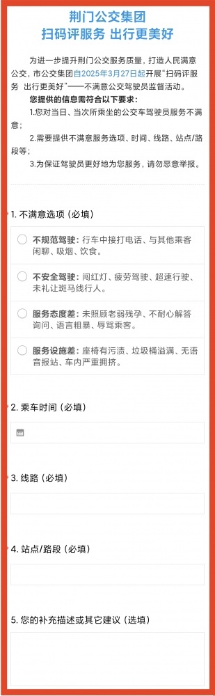 市民乘客可通過(guò)掃描公交車(chē)上的“服務(wù)監(jiān)督二維碼”,進(jìn)入“不滿(mǎn)意公交駕駛員監(jiān)督舉報(bào)”頁(yè)面,填寫(xiě)詳細(xì)舉報(bào)信息(評(píng)價(jià)頁(yè)面如下)。