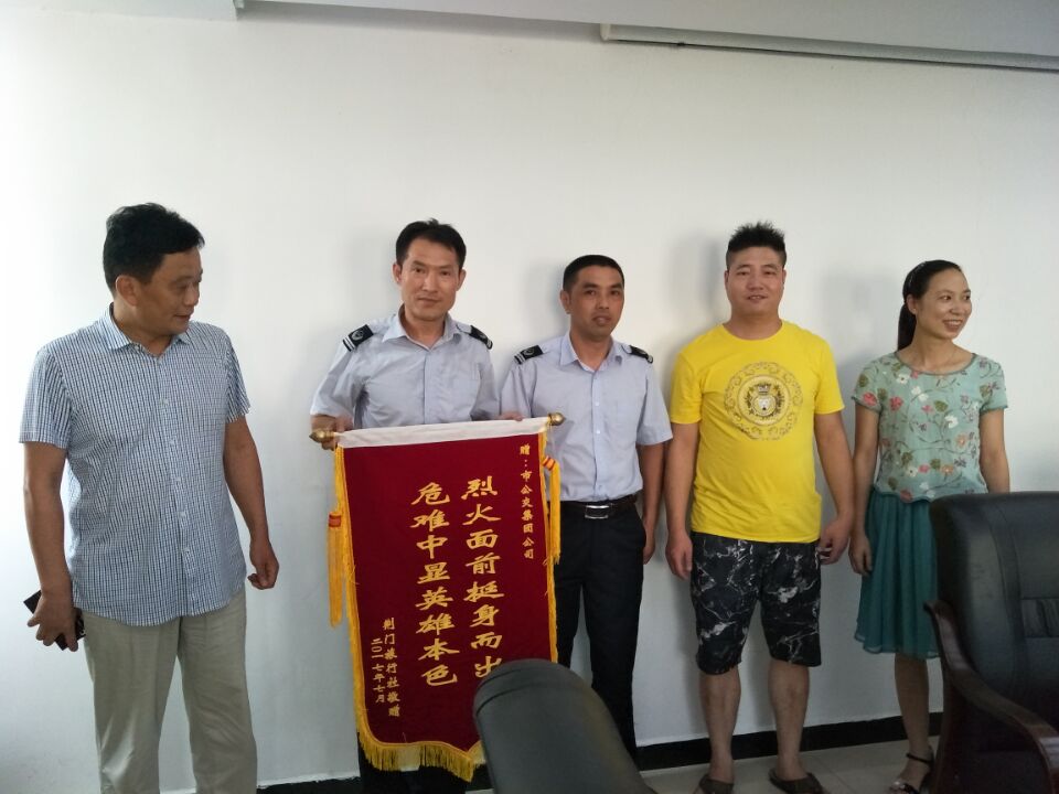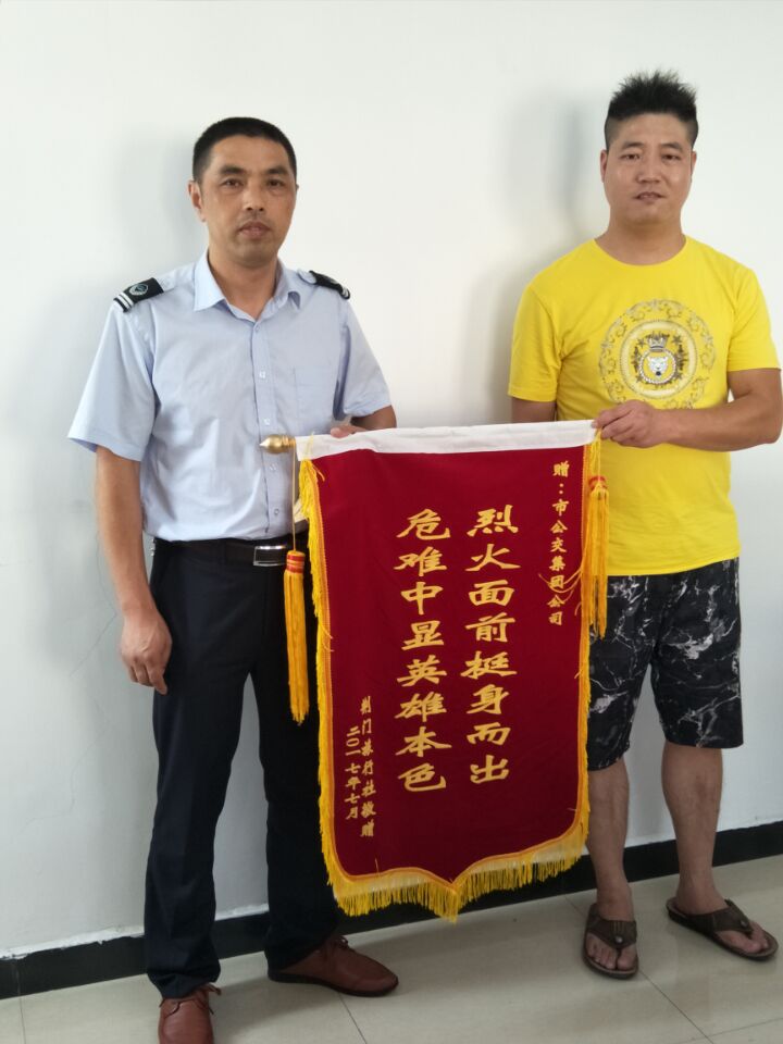 7月27日,荊門市旅行社出租汽車公司負責(zé)人及鄂H0A073的駕駛員專程來到荊門公交集團公司,為果斷義舉滅火的公交陳旭師傅送上了一面“烈火面前挺身而出,危難中顯英雄本色”錦旗。