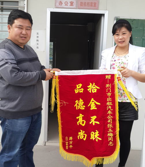 5月4日,乘客蔣女士從市出租汽車公司領(lǐng)回丟失的蘋果iphone5s手機(jī),感動(dòng)萬(wàn)分,并送上印有“拾金不昧品德高尚”錦旗,以表達(dá)對(duì)的姐張玉梅的謝意。