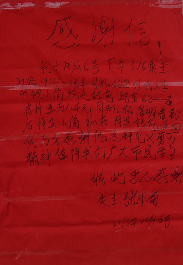 公交公司相關人員表示,對于楊昌明見義勇為的行為,肯定會給予獎勵。記者還了解到,失主張女士于7日將一封感謝信交到了楊昌明所在的公交公司,再次表達了她的感激之情。