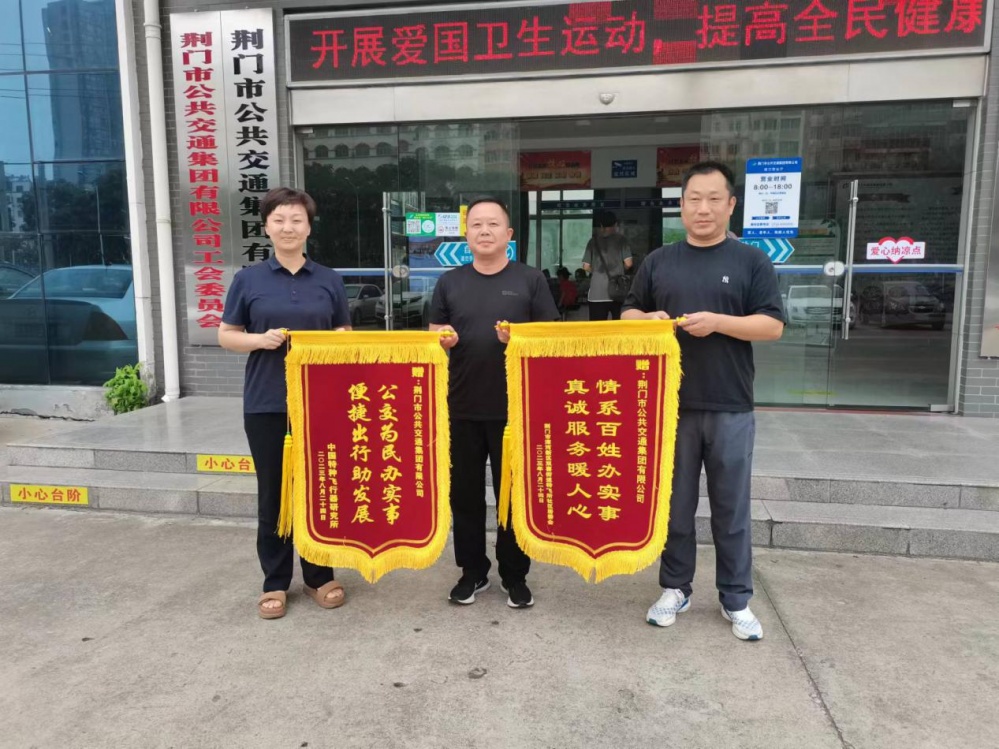 而另一邊,發(fā)現(xiàn)丟了錢包的賀先生在去往武漢的火車上著急萬分,抱著不確定的心態(tài)打電話到客服調(diào)度中心詢問,看能否找回,誰知火車才行至鐘祥站的時(shí)候,就接到了電話,說錢包已找到,賀先生頓時(shí)放下心來。待賀先生從武漢歸來后特地送來一面錦旗以表示感謝,為公交培養(yǎng)出李學(xué)鋒這樣拾金不昧的駕駛員師傅點(diǎn)贊。