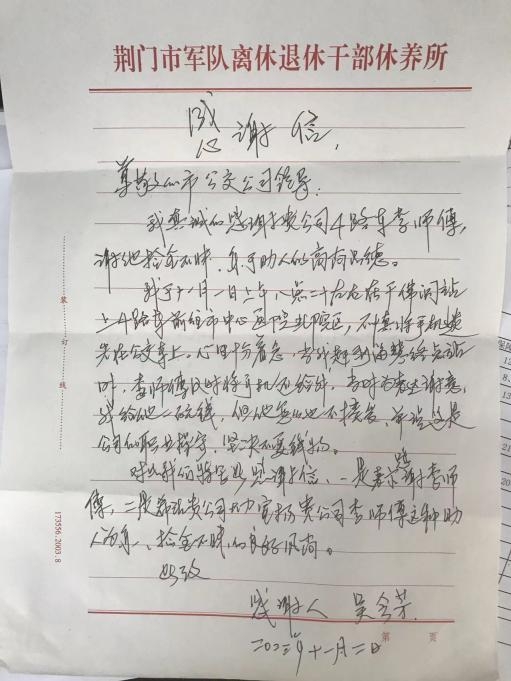 11月6日上午9時,公汽三公司收到由調(diào)度中心代收的一封感謝信,信中寫到“我真誠的感謝貴公司4路車李師傅,謝他拾金不昧。樂于助人的高尚品德”。
